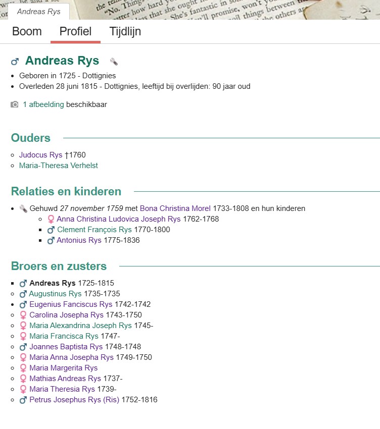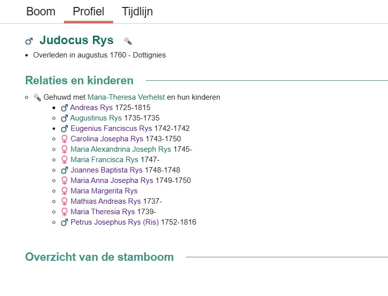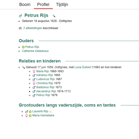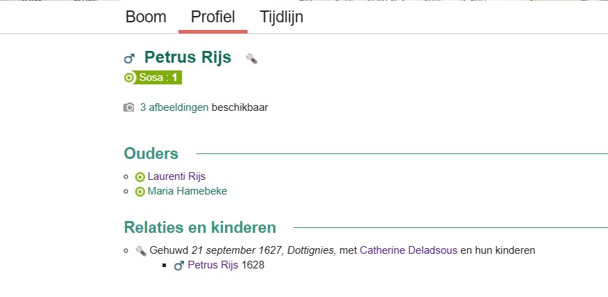 36 jaar oud 18 januari 1665 Geboorte van een zoon Adrianus Rijs Dottignies