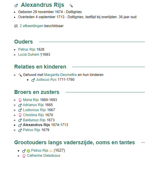 46 jaar oud 29 november 1674. Geboorte van een zoon Alexandrus Rijs Dottignies